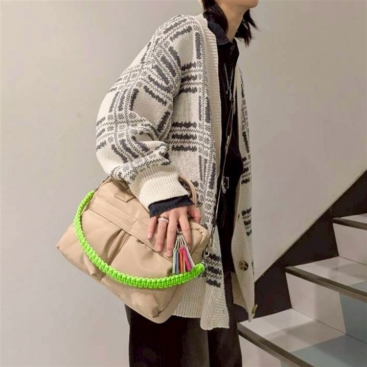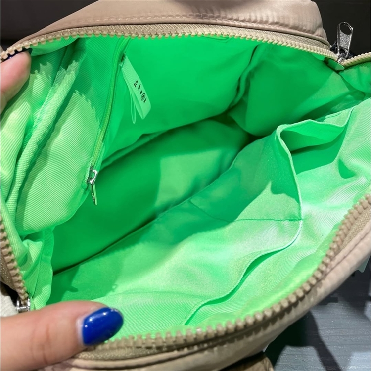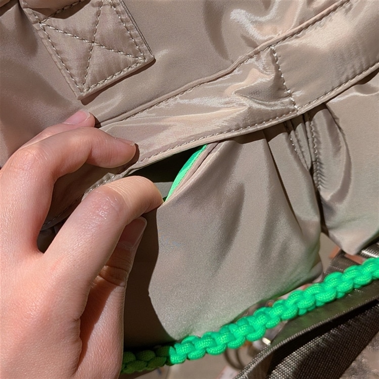 ミニマルフォルムに光沢感のあるナイロンとネオンカラーが映えるバッグとなっている。