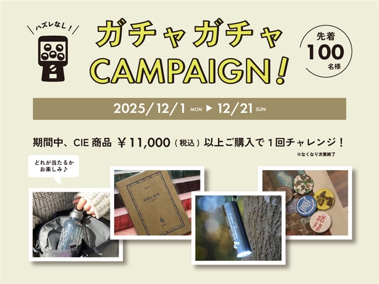 期間中¥11,000(税込)ご購入頂いたお客様にご参加いただけるガチャガチャキャンペーンでは、CIEオリジナルのボトルをはじめライトやメモ帳、缶バッヂなどが当たります。(先着100名様)
