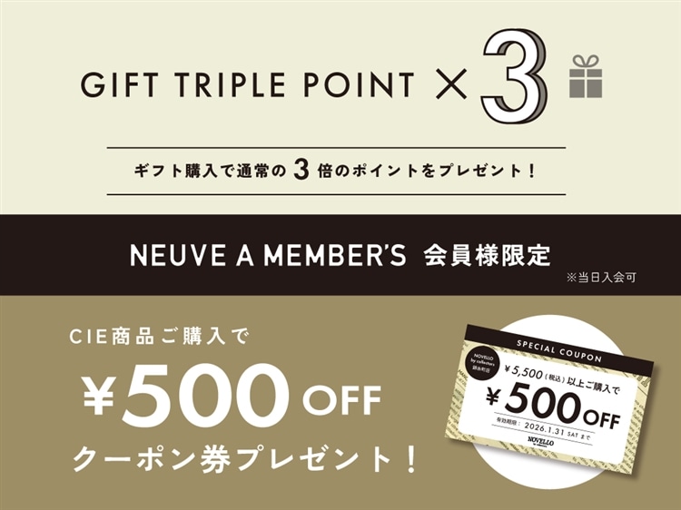 また、ヌーヴ・エイメンバーズ会員様を対象に、「ギフトのご購入でトリプルポイント進呈」や「NOVELLO by collectors錦糸町店で使えるクーポンプレゼント」を同時開催!ホリデーシーズンのお買い物が更にお得になります。